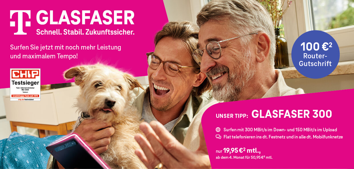 2) Aktion gilt bis 02.02.2026 für Breitband-Neukunden, die in den letzten 3 Monaten keinen Breitbandanschluss bei der Telekom hatten. Glasfaser 300 kostet in den ersten 3 Monaten 19,95 €/Monat, danach 50,95 €/Monat. Bei Miete eines Routers im Endgeräte-Service-Paket (i. H. v. 7,95 €/Monat) erfolgt eine Router-Gutschrift i. H. v. 100 €. Hardware zzgl. 6,95 € Versandkosten. Der einmalige Bereitstellungspreis für einen neuen Telefonanschluss beträgt 69,95 €. Die Mindestvertragslaufzeit für Glasfaser 300 beträgt 24 Monate, für Hardware 12 Monate. Alle Preise inkl. der gesetzlichen MwSt. Für die Bereitstellung von Glasfaser 300 ist ein Glasfaser-Hausanschluss erforderlich. Sofern noch nicht vorhanden, wird dieser bei einer verbindlichen Buchung des Tarifs Glasfaser 300 neu verlegt, vorausgesetzt, die Anschlussadresse für den Tarif ist mit der Adresse des mit Glasfaser anzuschließenden Gebäudes identisch. Die Bereitstellung erfolgt, wenn Hauseigentümer/Hausverwaltung dem Ausbau zustimmen und die finale Prüfung den Ausbau bestätigt. Durch Eingabe einer Adresse auf der Internetseite telekom.de/glasfaser kann geprüft werden, ob diese in einem Glasfaser-Ausbaugebiet der Deutschen Telekom liegt.