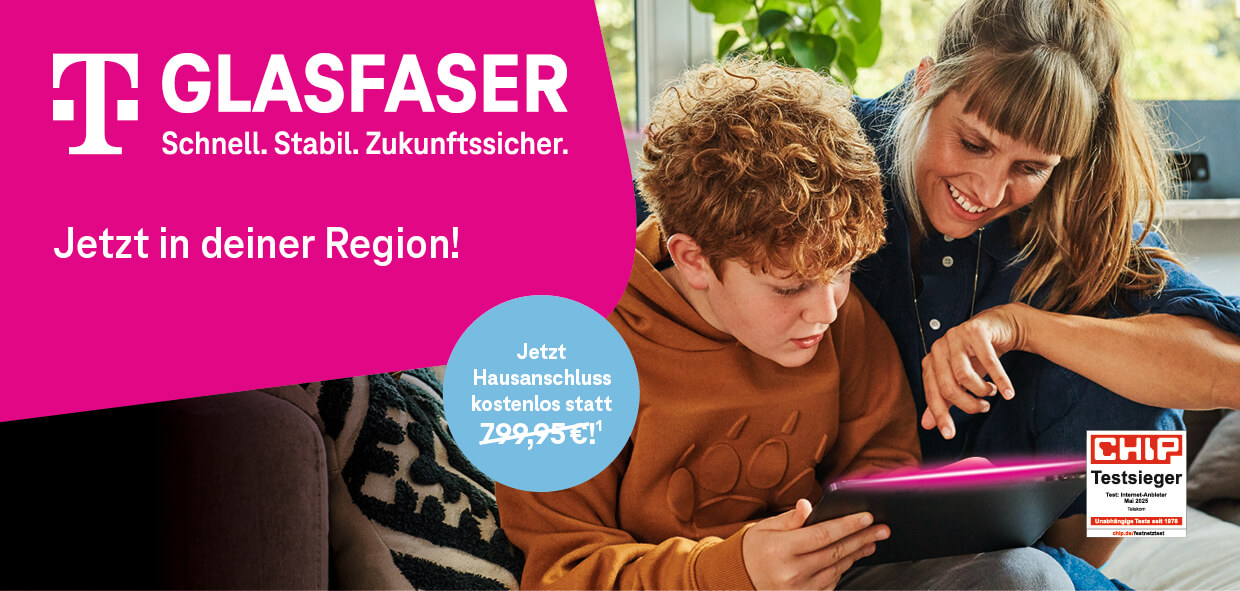 1) Für die Bereitstellung eines Glasfaser-Tarifs ist ein Glasfaser-Hausanschluss erforderlich. Sofern noch nicht vorhanden, wird dieser bei der verbindlichen Buchung eines Glasfaser-Tarifs kostenfrei neu verlegt, vorausgesetzt, die Anschlussadresse für den Tarif ist mit der Adresse des mit Glasfaser anzuschließenden Gebäudes identisch. Die Bereitstellung erfolgt, wenn Hauseigentümer/Hausverwaltung dem Ausbau zustimmen und die finale Prüfung den Ausbau bestätigt. Als Glasfaser-Tarif gilt z. B. Glasfaser 150, in den ersten 3 Monaten für 19,95 €/Monat, danach für 45,95 €/Monat. Aktion gilt bis 02.02.2026 für Neukunden, die in den letzten 3 Monaten keinen Breitbandanschluss bei der Telekom hatten. Einmaliger Bereitstellungspreis für neuen Telefonanschluss 69,95 €. Mindestvertragslaufzeit 24 Monate. Alle Preise inkl. der gesetzlichen MwSt. Durch Eingabe einer Adresse auf der Internetseite telekom.de/glasfaser kann geprüft werden, ob diese in einem Glasfaser-Ausbaugebiet liegt.